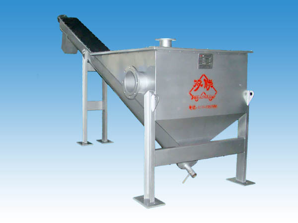 砂水分離器設(shè)備角度一般在20-30°之間,砂水混合液從分離器一端頂部輸入水箱,混合液中重度較大的如砂粒等將沉積于槽形底部,在螺旋的推動(dòng)下,砂粒沿斜置的U型槽底提升,離開液面后繼續(xù)推移一段距離,在砂粒充分脫水后經(jīng)排砂口卸至盛砂桶,而與砂分離后的水則從溢流口排出并送往廠內(nèi)進(jìn)水池。